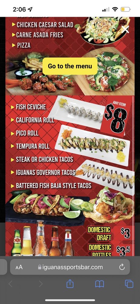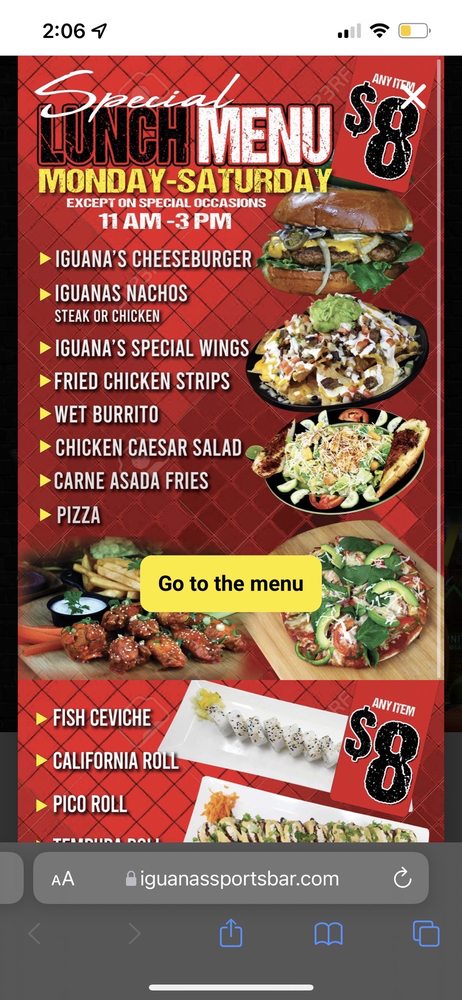 Introducing the menu at Iguanas Bar, located in Pico Rivera, CA, offers a vibrant mix of dance club, sports bar, and pizza restaurant. With a range of appetizers like Fried Chicken Strips, Iguanas Nachos, and Quesadillas, this spot caters to diverse tastes. Favorites such as Marsico's Seafood Ceviche Mixto and Camarones showcase the rich flavors on offer. For entrees, options like Rib Eye Steak and Chicken California bring a satisfying twist to classic dishes. Positive reviews highlight the delicious food, great drinks, and attentive staff, creating a welcoming atmosphere for guests. Don't miss the Happy Hour specials or karaoke nights for a memorable experience at Iguanas Bar. Experience the versatile DJ, affordable prices, and ample parking that make this spot a standout in the area.